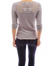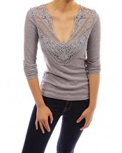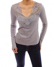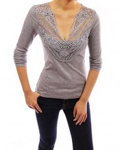 PattyBoutik V Neck Floral Lace Crochet Inset Long Sleeve Knit Blouse (Gray 8/10)