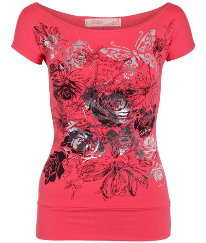 Shop Womens Butterfly Floral Foil Print Boat Neck Batwing Top T Shirt Blouse New (Coral,8)