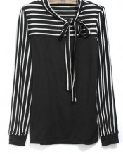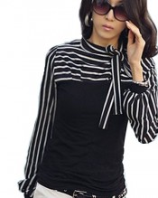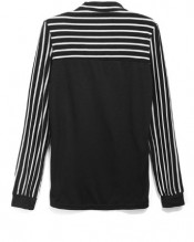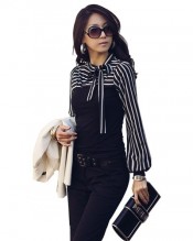 Women Blouses Polo Neck Puff Black White Stripe Long Sleeve Shirt Tops
