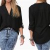 Women Sexy V-Neck T Shirt Blouse Long Sleeve Stand Collar Chiffon Tops Black XXL