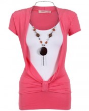 Womens Boho 2 in 1 Low Cut Pleated Knot Hem Long Sleeveless Top Necklace Party (Coral,16)