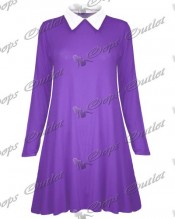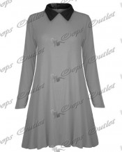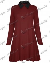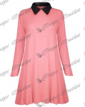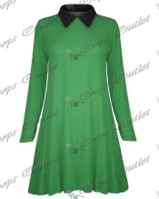 Womens Ladies Casual Plain Collared Long Sleeves Flared Jersey Swing Dress Top