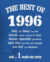 This premium quality T-shirt is made of 100% cotton. The original design printed on the shirt highlights a number of lighthearted, positive (sometimes tongue in cheek) events which happened exactly 18 years ago. You can be confident that this T-shirt will be the most talked-about present of the day.