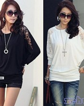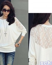 Zehui Lady’s Batwing Dolman Stylish Loose Blouse Long Sleeve Shirt Lace Tops T-Shirt White