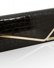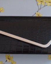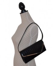 High Quality Crocodile embossed Clutch in high shine black patent leather finish with silver metal trim and our logo.