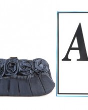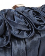 Navy blue satin clutch bag with gentle pleats and satin flowers on the front