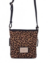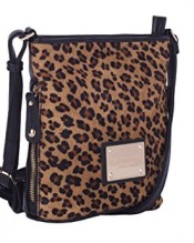 A really stylish handbag from the new collection from Smith & Canova. This is a bucket shaped leather handbag, medium sized, with leopard print hair on the front, and a plain brown back. The bag closes with a full zip across the top, and has two small slip pockets on either side of the bag. Inside the bag is lined in green monogrammed satin with a small zip up pocket. The metalwork is gold coloured, and the long shoulder strap is adjustable so the bag can be worn across body or on the shoulder.