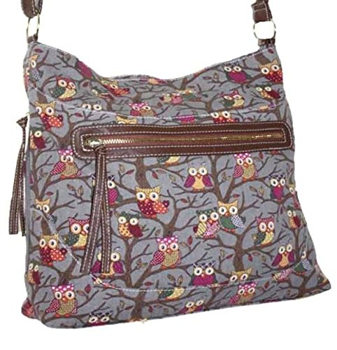 New Ladies Womens Canvas Oilcloth Faux Leather Crossbody Shoulder Bag Handbag Girls Large School Bag Owl Butterfly PolkaDot Horse Dragonfly Design HB-2478 (Canvas Owl Grey)