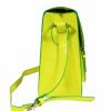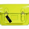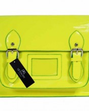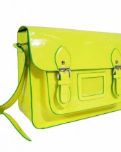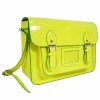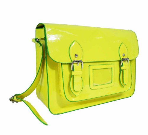 Womens cross body Patent leather satchel by Quenchy London. Ladies large messenger style handbag in the classic retro school satchel style. In stunning neon fluorescent colours.