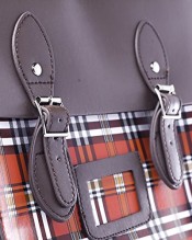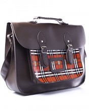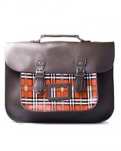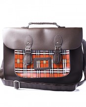Large Brown Satchel Bag with Red Tartan Print Pocket