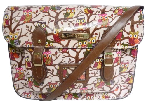 New Anna Smith LYDC Owl Print Saddle Satchel College Oilcloth Patent leather School Retro Vintage Messenger Bag