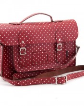 Giving a playful twist to a classic is this 14″ Belforte Leather Satchel by Yoshi. It is finished in a traditional satchel leather and has been detailed with a white polka dot design. The inside is unlined to give the satchel a traditional look. This Yoshi satchel features a grab handle on the top and a removable adjustable leather shoulder strap with metal dog clips. There is a slip pocket on the front of the bag and there is a retro ID detail on this pocket. The satchel closes with two push through traditional buckle fasteners. There is a Yoshi fabric label on the front and the bag is supplied in a Yoshi branded Dustbag.