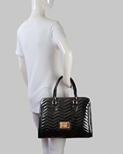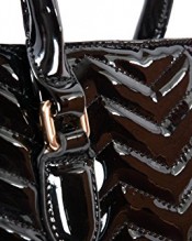A high gloss patent handbag in classic style brought up to date with a chevron style print on the front.