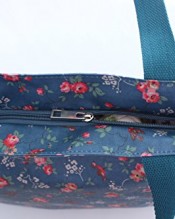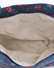 Print: navy blue garden birds. Features: with a removable matching wallet, floral print webbed handles, “Florence Happy @ England” logo cotton lining and zip top closure