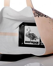 Luxury bags from the artware UK based, brand Diorama Concept featuring unique art print by graphic artists. This full leather shoulder bag is part of “Fragments of a painted life” collection by visual artist Anca Ignatescu.
