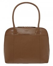 Tan leather grab bag by Osprey with twin handles, subtle embossed branding, double zip fastening and a spacious interior.