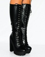 Ladies Black faux PU leather lace up knee high platform high heel boots.