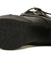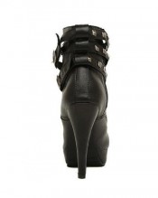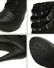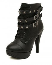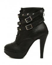 Military biker style boots featuring lace up design with side zipper closure embellished with buckles and studs. Round toe front with platform base and stiletto heel and finishes off with a soft insole.