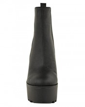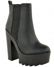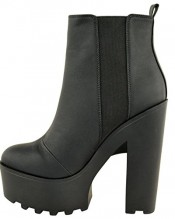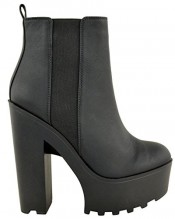 LADIES WOMENS CLEATED ELASTIC PLATFORM BOOTS CHUNKY BLOCK HIGH HEEL ANKLE SHOES (UK 5, Black Faux Leather)