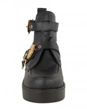 LADIES WOMENS CUT OUT BOOTS FLAT LOW HEEL STRAPPY CHUNKY GOLD BUCKLE TRIM BIKER CHELSEA ANKLE SHOES SIZE (UK 5 / EU 37 / US 7, Black Faux Leather)