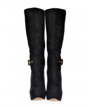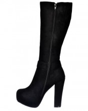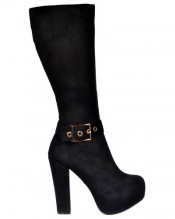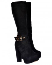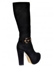 Treat Your Autumn/Winter Wardrobe to These Fabulous Designer Inspired Black Suede Knee High Winter Boots. Strap and Large Gold Buckle Feature To The Ankle, Finished in Black Faux Suede With a 5.25 Inch Block Heel and 1.5 inch Concealed Platform. Zip for Easy On / Off.