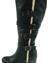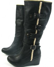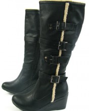 NEW LADIES WIDE CALF KNEE HIGH WEDGE HEEL TAN BROWN FUR BIKER BOOTS SIZE 3 4 5 6 7 8 (UK 3, Black)