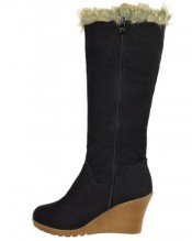 NEW LADIES WOMENS MID WEDGE HEEL FUR LINED WARM WINTER KNEE HIGH CALF BOOTS SIZE (UK 4 / EU 37 / US 6, Black Faux Leather)