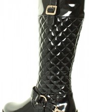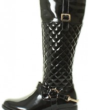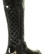 NEW WOMANS LADIES KNEE HIGH FLAT HEEL PATENT BLACK GOLD QUILTED BIKER RIDING BOOTS SIZE 3 4 5 6 7 8 (UK 6, Black)