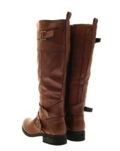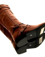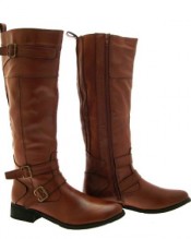 Classic riding boots design with flat heel and decorative strap with buckle at the top of the boot and ankle. The knee length measures 39cm and the heel is 3cm. The