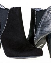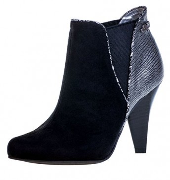 These Louise women’s ankle boots by Ruby Shoo have a black faux suede upper with subtle pattern trim and a metallic textured heel panel. The metal Ruby Shoo logo adds a high end finish and the angular high heel is something a little different. These ladies high heel fashion boots also feature a round toe, elasticated side panels and rubber sole. Brand: Ruby ShooStyle: Louise high heel ankle bootsHeel: 3.75 inch high heelToe: RoundMaterial: Faux leatherClosure: Slip onBoot opening: 11 inchesBoot height: 7 inches including heel