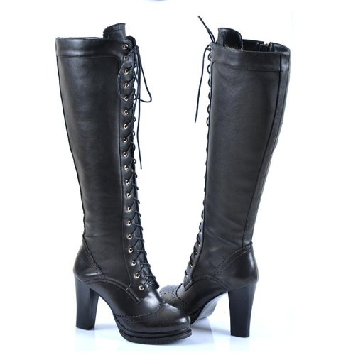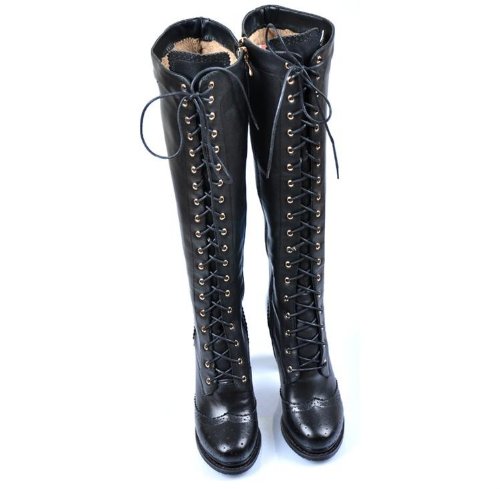 Sheepskin Ladies Retro Real Leather Lace Up Block Heel Knee High Wemen Boots (UK-size-5, Black)