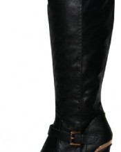 Stunning New Sexy Black Faux Leather Knee High Heel Boots Gold Buckle Strap