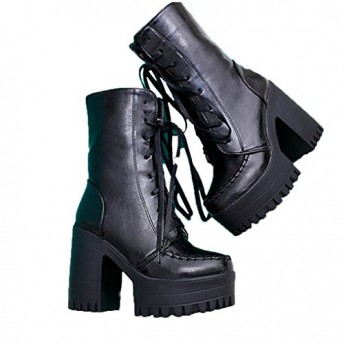 Three’s Ladies Platform Heel Ankle Boots Lace Up Chunky Heel Sexy Biker Combat Boots (9, black)
