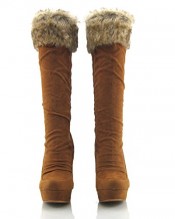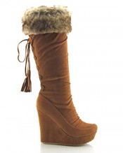 WOMENS KNEE HIGH PLATFORM LADIES HIGH HEEL FUR WEDGE BOOTS SIZE 3 4 5 6 7 8 (UK 3 / EU 36 / US 5, TAN FAUX SUEDE)