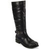 WOMENS LADIES KNEE HIGH FLAT LOW HEEL BIKER STUD STUDDED BUCKLE RIDING BOOTS (UK 5 / EU 38, BLACK PU)