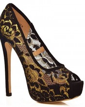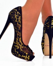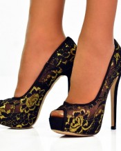 Black golden lace peep toe stiletto high heel date party evening shoes