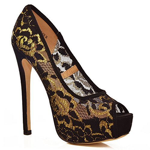 Black golden lace peep toe stiletto high heel date party evening shoes