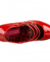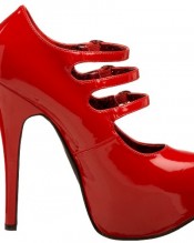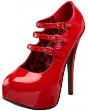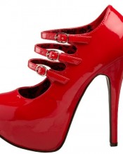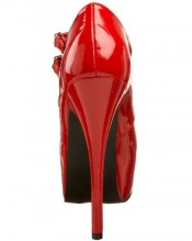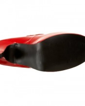 A striking bright red patent high heel shoe from Pleaser’s Bordello range. It has a 5.75″/14.5cm stiletto heel and 1.75″/4.5cm concealed platform. 3 straps with buckles. Round toe. Manmade upper, inner and sole.