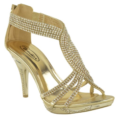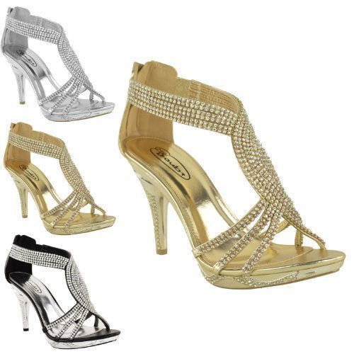 LADIES WOMENS DIAMANTE HIGH HEEL PROM WEDDING BRIDAL BRIDESMAID PARTY SHOES SIZE (UK 3, Gold Metallic)