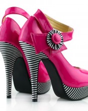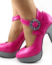 Eye catching amazing Patent material. Further enhanced by its feature of a white and black flower and a delightful ankle strap. Platform high heel design with black and white srtipe covered.