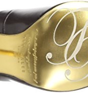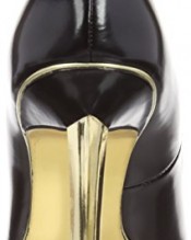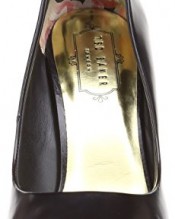 Luxe court shoe from Ted Baker made from a high shine black leather with elegant gold metal tip. The slip on has a pointed toe and angled gold stiletto heel with a height of approximately 10cm / 4 inches.