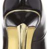 Luxe court shoe from Ted Baker made from a high shine black leather with elegant gold metal tip. The slip on has a pointed toe and angled gold stiletto heel with a height of approximately 10cm / 4 inches.