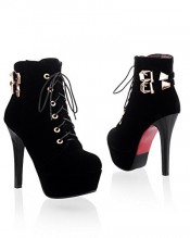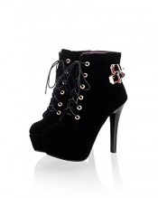 WeenFashion Womens Closed Round Toe High Heel Frosted PU Solid Boots with Bandage, Black, 2 UK