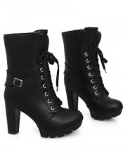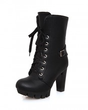 WeenFashion Womens Closed Round Toe High Heel Platform PU Short Plush Solid Boots with Bandage, Black, 1 UK