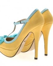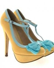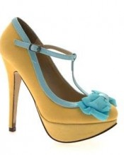 WOMENS HIGH HEEL COURT PLATFORM MARY JANE T BAR BOW FAUX SUEDE LADIES SHOES YELLOW/BLUE 7