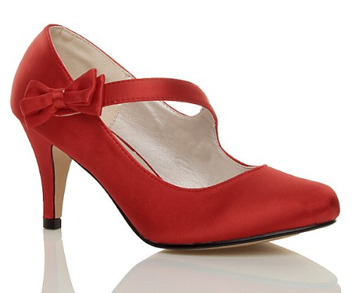 WOMENS LADIES MID HIGH HEEL STRAP BOW WEDDING BRIDAL EVENING SHOES SIZE 5 38