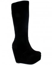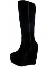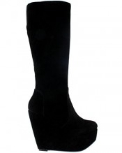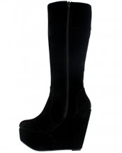 These knee high boots feature a faux suede upper, high wedge heel, platform sole and double stitching accents on the heel and vamp. The boot has been completed with a full length zip on the inner side and an elasticated section on the back.